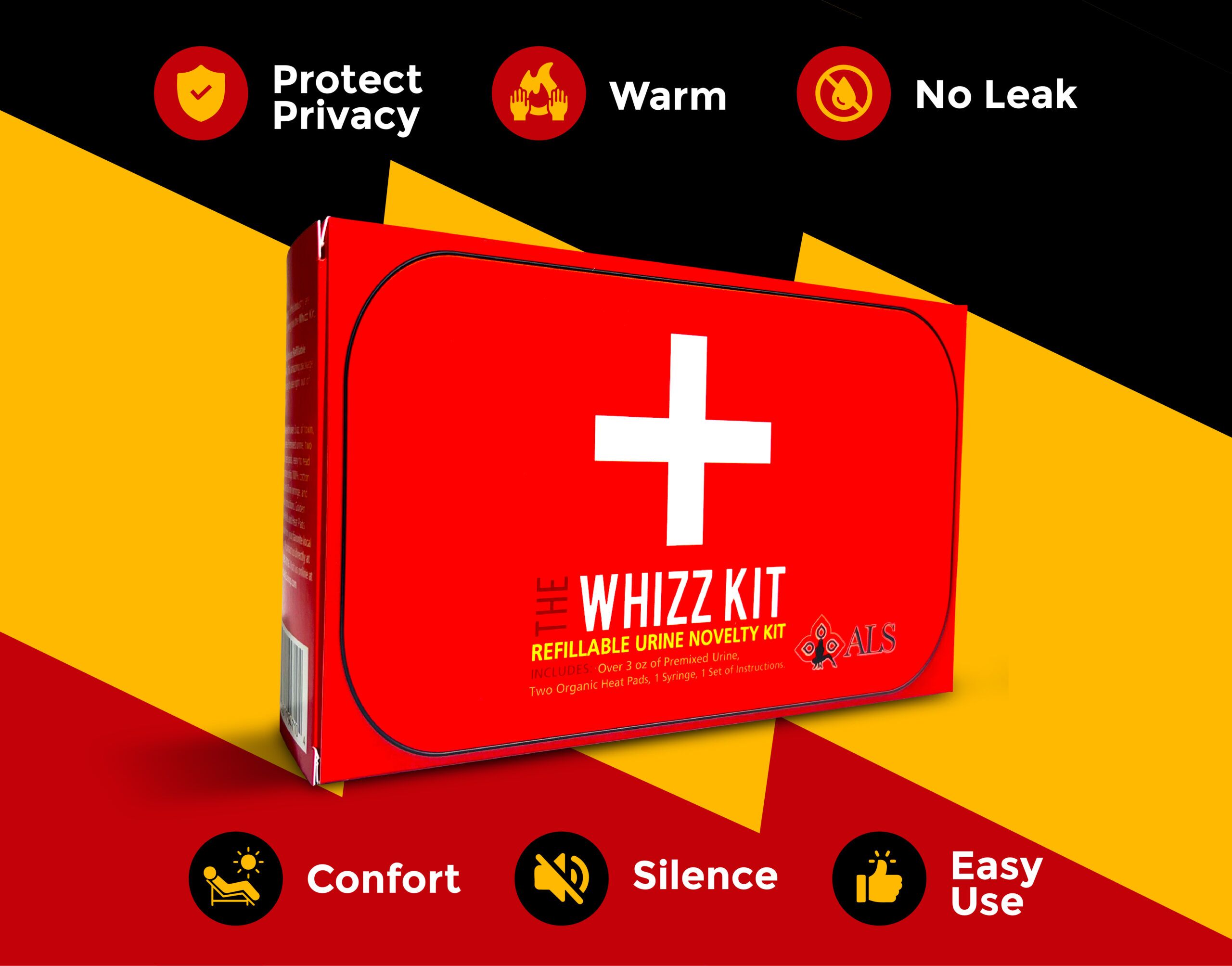 Each WhizzKit® package includes pre-mixed synthetic urine, two heat pads, a temperature strip, a refill syringe, a detachable elastic belt with pouch, and detailed instructions.